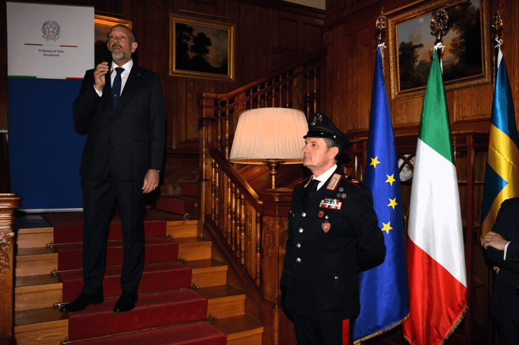 Inbjudan till den stora mottagningen för att fira Republiken Italiens 79:e nationaldag, som hölls på den italienska ambassaden i Stockholm. Michele Pala – Italiens ambassadör i Sverige – hälsade alla inbjudna gäster välkomna. Nationalsånger sjöngs och sedan började mottagningen. Många nya sponsorer för kvällen: